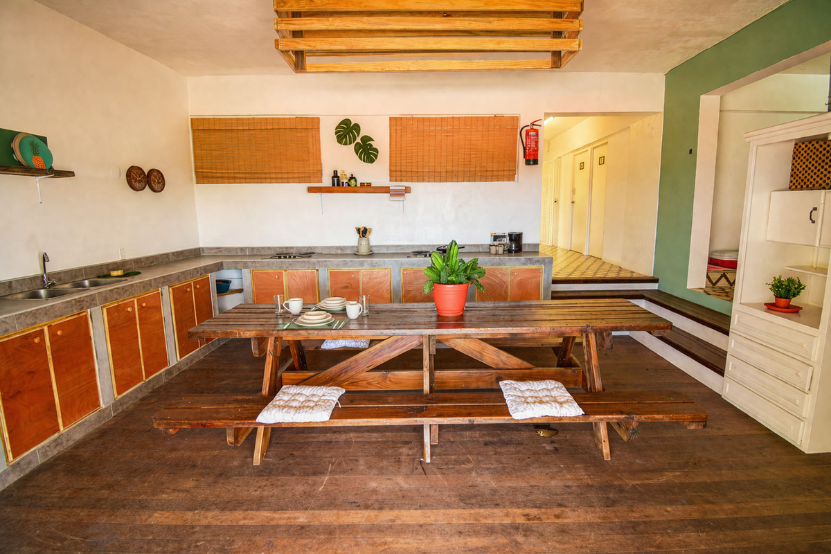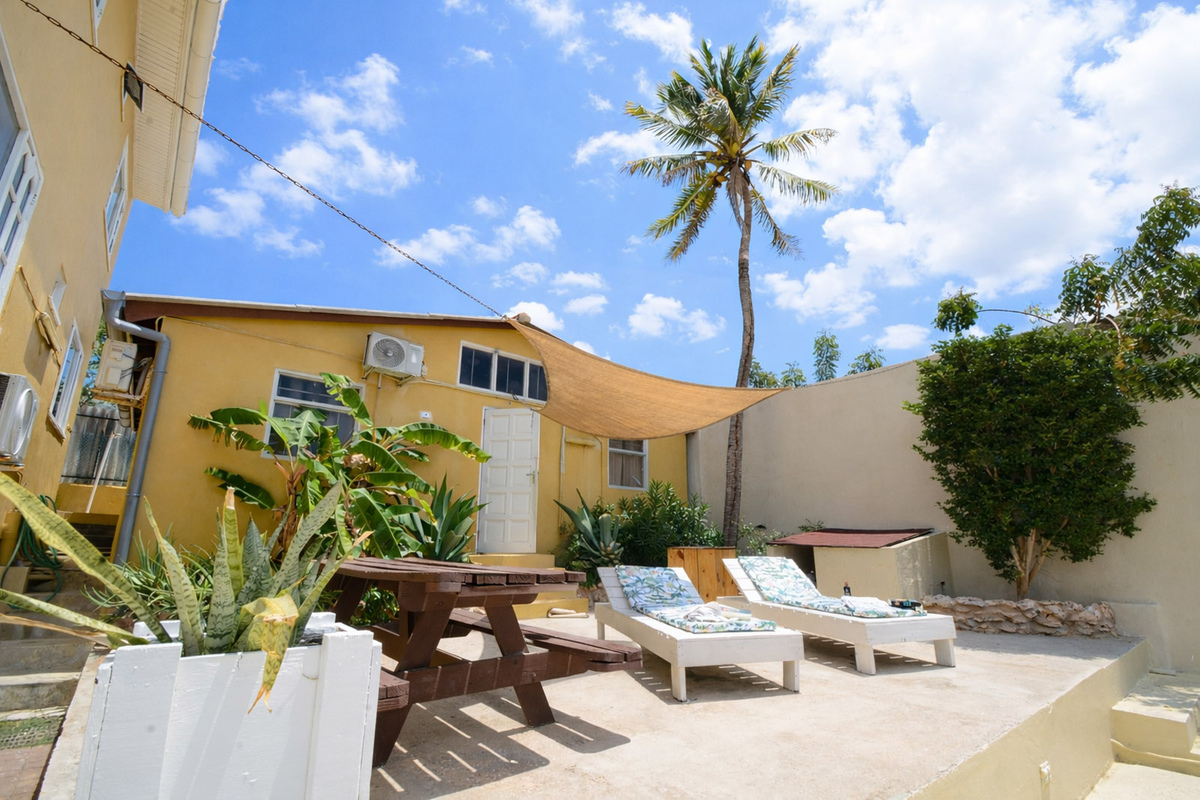Het eerste wat overvalt aan de Telamonstraat 8 is de ruime opzet en de vele terrassen vanwaar je een fantastisch uitzicht hebt over de Caribische zee! Dit jongerencomplex is gebouwd op meer dan 1700 m2 en de kamers en studio's zijn verdeeld over een vijftal gebouwen. Hierdoor heb je naast een sociale omgeving ook altijd ruimte om je even terug te trekken in je privé kamer/ studio of één van de gezamenlijke ruimtes. Op de Telamonstraat 8 beschikken wij in totaliteit over 4 gezamenlijke keukens waarvan de hoofdkeuken is voorzien van een dubbel fornuis. Verdeeld over de keukens tref je aan: koelkasten, een oven, een magnetron, een waterkoker en/of een koffiezetapparaat. De studio's beschikken over een eigen kitchenette waar een kooktoestel staat met een waterkoker. Daarnaast is het ook nog mogelijk om een privé koelkast (beperkt voorradig) in je kamer bij te huren mocht je dat prettig vinden. De studio's zijn standaard uitgerust met een koelkast. In totaal, inclusief de zeven studio's beschikt dit complex over een 15-tal badkamers waarvan er een drietal gezamenlijke badkamers ook zijn uitgerust met warm water. Iets wat je eigenlijk niet nodig hebt in de tropen maar op uitzonderlijke koelere dagen wel prettig kan zijn.